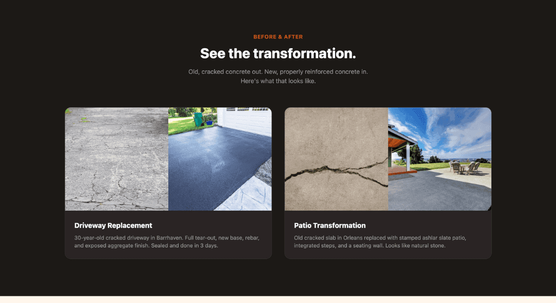 Two before/after project cards on a dark background show real transformations — a cracked driveway replaced with exposed aggregate, and an old slab turned into a stamped patio. Below, a warm orange-tinted "Built to Last" section explains why the concrete won’t crack — proper base prep, rebar reinforcement, control joints, and a written warranty. Four benefit cards with technical details give homeowners confidence that this isn’t a fly-by-night operation.