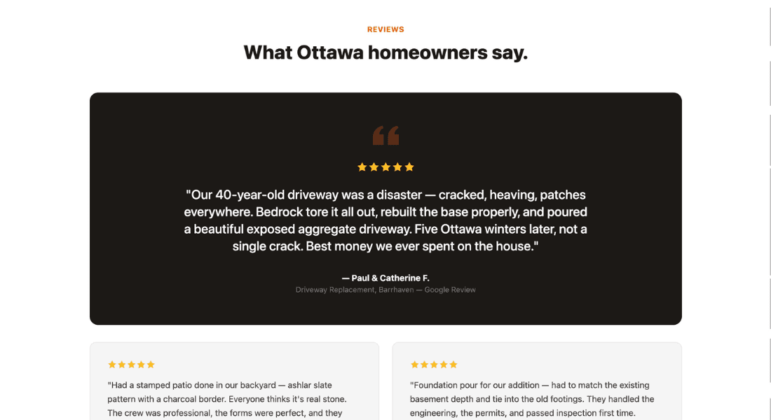 A featured pull-quote on dark background tells a detailed driveway replacement story — five Ottawa winters, not a single crack. Two smaller review cards below cover a stamped patio and a foundation pour. Each review names a specific Ottawa neighbourhood for local SEO. The specificity — "ashlar slate pattern," "passed inspection first time" — builds credibility that generic praise never could.