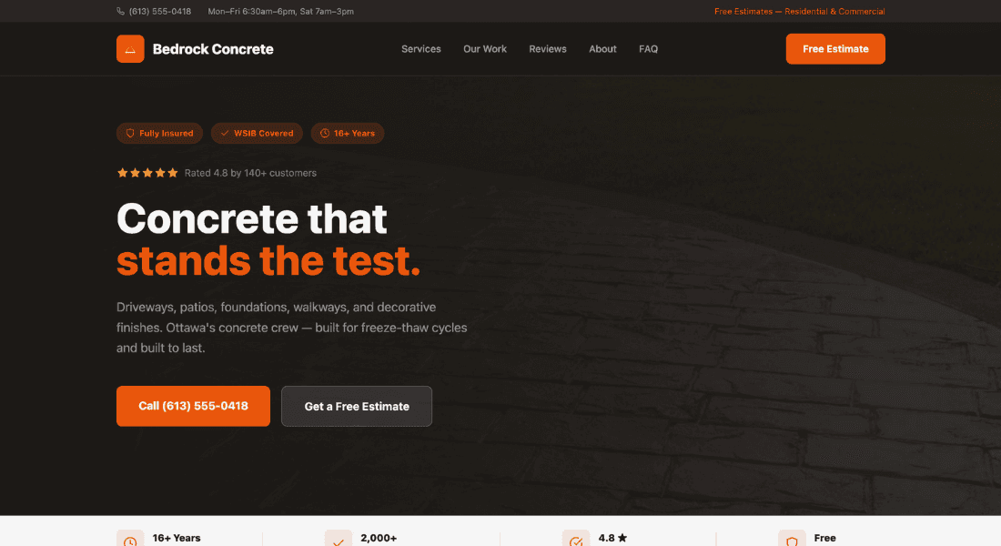 A full-width hero with a stamped concrete texture photo as the background and a left-to-right gradient overlay. The dual-tier nav puts the phone number and "Free Estimates" in a top utility bar, keeping it accessible on every device. Credential pills, star rating, and dual CTAs sit left-aligned for a bold, authoritative feel. The credential strip below reinforces years, projects, rating, and free estimates. This template feels industrial but approachable — exactly how a concrete company should present online.