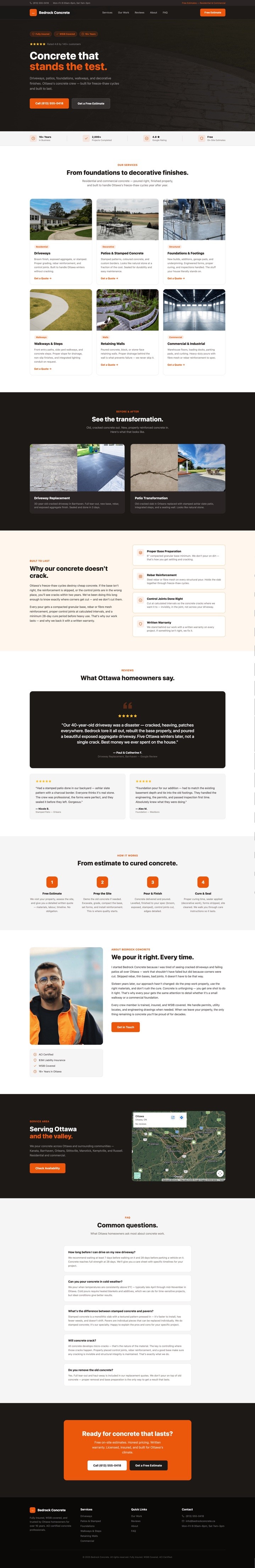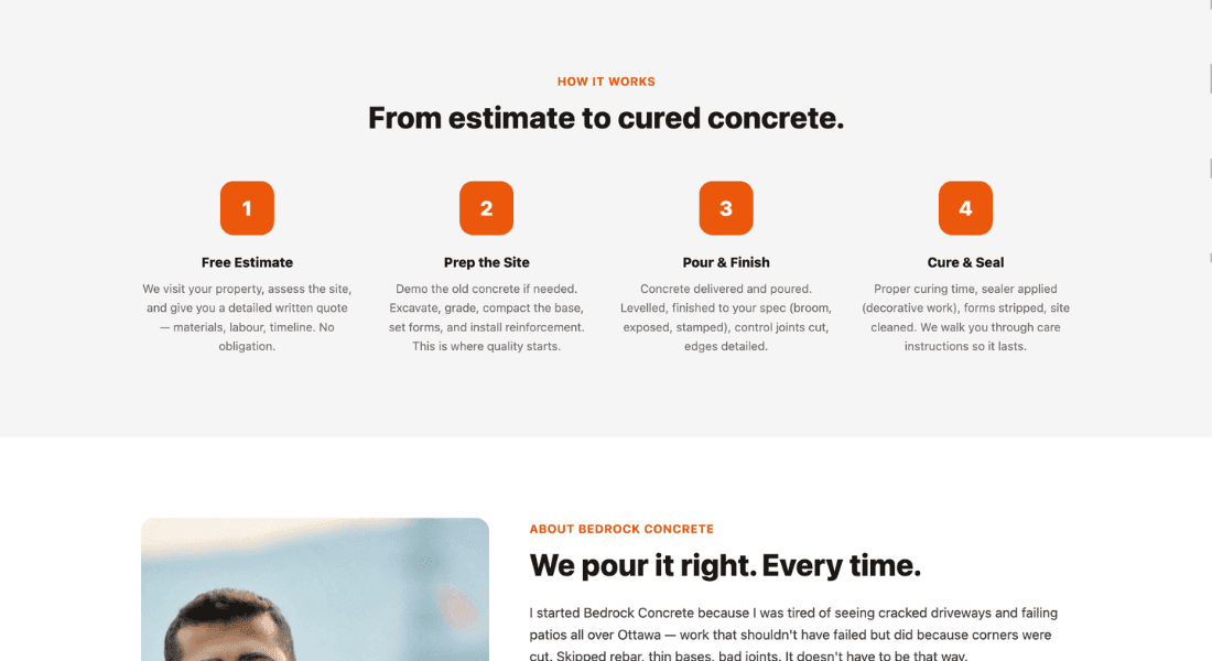 A four-step process — estimate, site prep, pour & finish, cure & seal — walks homeowners through the full timeline. The About section features the owner’s story with a credential card listing ACI certification, $3M insurance, WSIB, and 16+ years in Ottawa. The owner’s story emphasizes the "you get one shot" reality of concrete work and why prep matters more than anything.