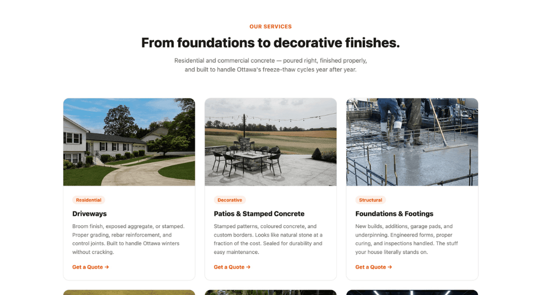 A 3×2 grid of image-forward service cards — driveways, patios & stamped, foundations, walkways, retaining walls, and commercial. Each card has a project photo, a pill tag (Residential, Decorative, Structural, Commercial), a description, and a quote link. This is the widest service grid in the portfolio and reflects the breadth of work concrete companies do. Homeowners see every option at a glance and find exactly what they need.