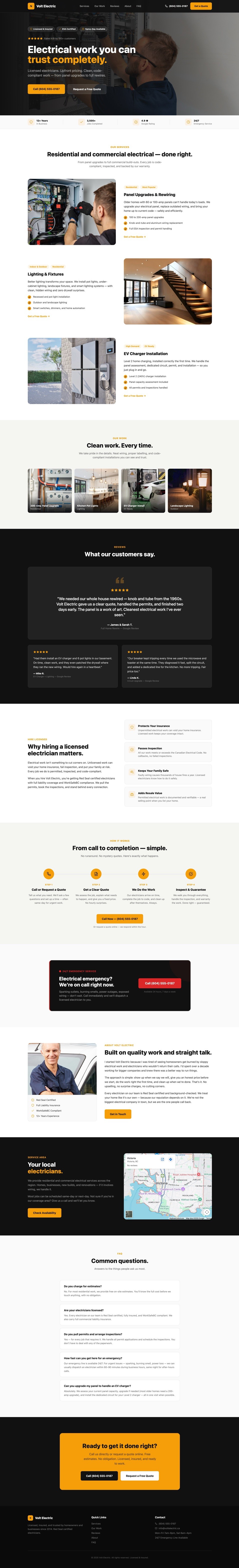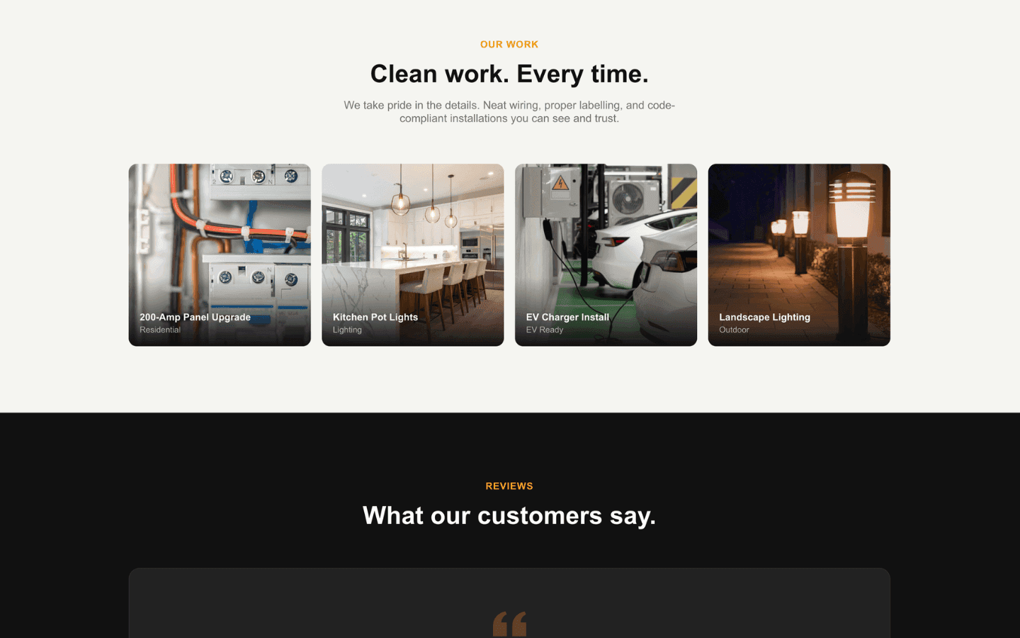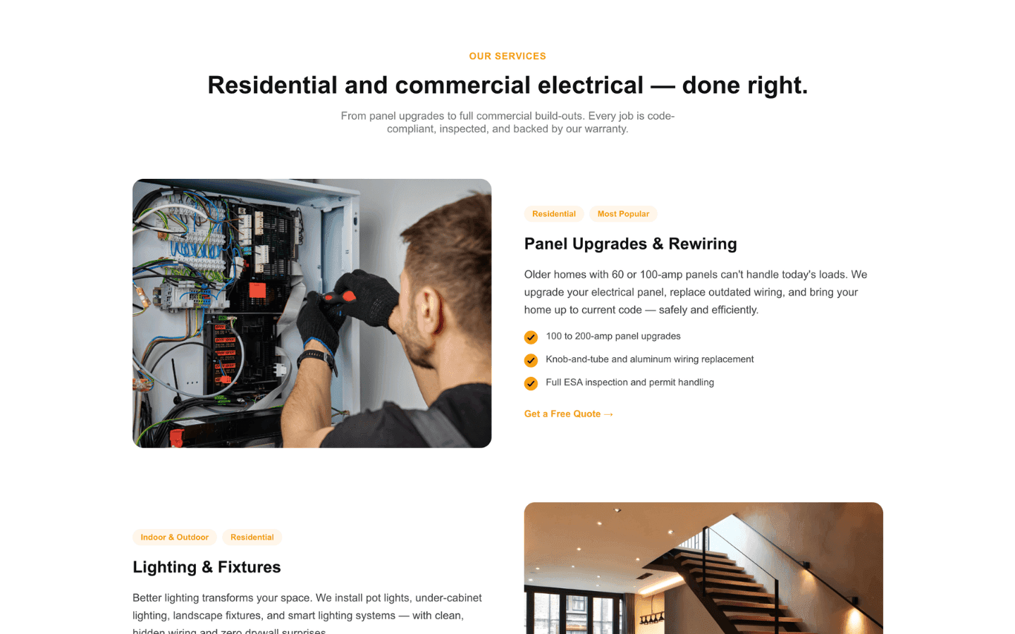 Three detailed service sections with real photos, bullet-point features, and a direct call to action on each. Homeowners find what they need fast. You stop getting calls for work you don't do — and start getting calls for panel upgrades, EV chargers, and lighting installs that are worth your time.
