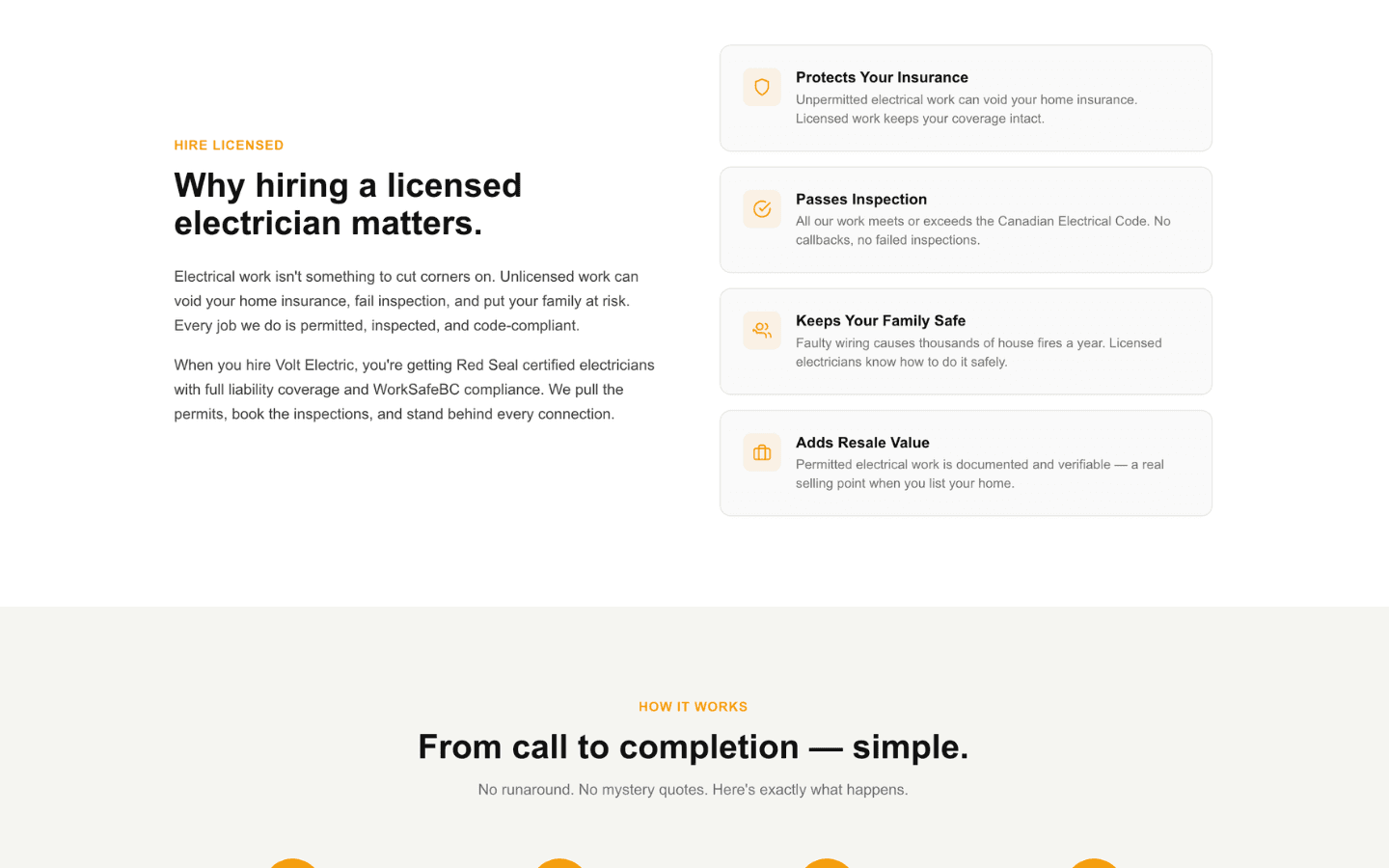Most homeowners don't know the risks of unlicensed electrical work. This section explains it in plain language — insurance issues, code violations, fire risk — then positions you as the safe, professional choice. It builds trust and it ranks on Google for "licensed electrician" searches in your area.