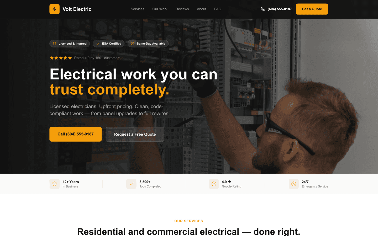 A homeowner searching for an electrician wants one thing first: proof you're legit. The hero puts your license, phone number, and five-star rating front and centre. No hunting, no guessing. They see a professional who's ready to take their call.