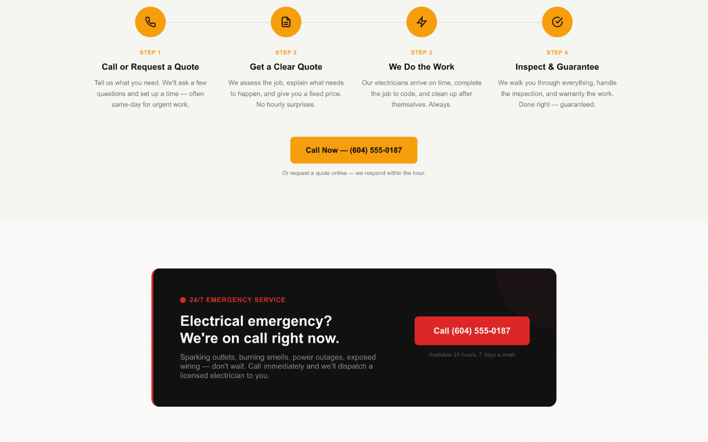 A four-step timeline shows exactly how it works from first call to final inspection — no surprises, no confusion. Below it, a dedicated emergency section with a red accent and prominent phone number catches the homeowner whose power is out at 10 PM. Those are the highest-value calls, and this makes sure they find you.